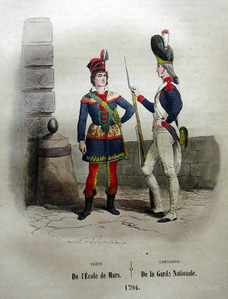 Links ein Trompeter, und neben dem Standartenträger rechts ein Offizier der Kavallerie der École de Mars.