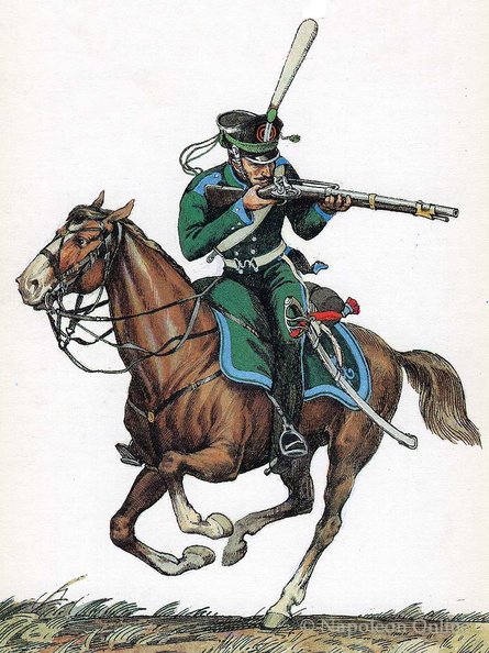 Die dargestellten Jäger tragen Röcke, die denjenigen aus der Vorschrift von 1786 ähneln; während der Revolutionszeit setzte sich der Dolman als Bekleidung durch. Vielleicht ein Hinweis auf Zeichnungen früherer Jahre?